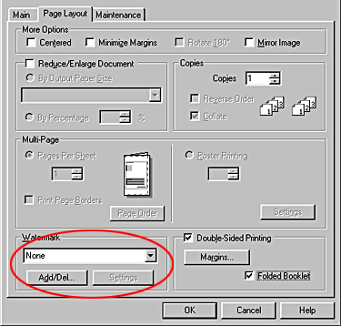 Click Add/Del under Watermark on the Page Layout menu. The following dialog box appears.