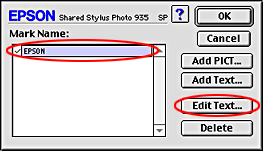 The image file name or the watermark text appears in the Mark Name list in the Watermark dialog box. To change the name of an image watermark, select it from the list, and then type a new name. When a text watermark is selected in the Name list, you can edit the text or change the font and text style by clicking Edit Text.