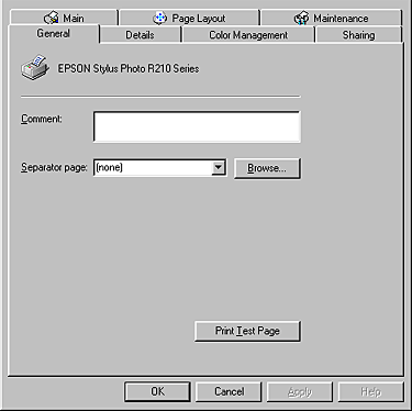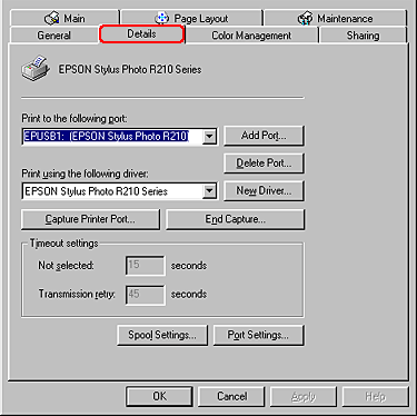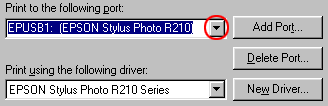 If EPUSBX: (EPSON Stylus Photo R210) is displayed in the Print to the following port list, then the USB printer device driver and printer software are installed correctly. If the correct port is not displayed, proceed to the next step.
