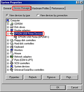 If your drivers are correctly installed, EPSON USB Printer Devices should appear on the Device Manager menu.