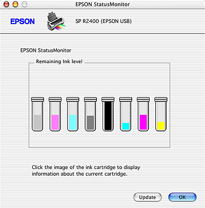 The graphic displays the amount of ink that was remaining when EPSON StatusMonitor was first opened. To update the ink-level information, click Update.