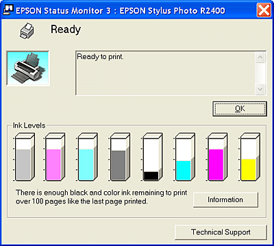 If any of the ink cartridges installed in the printer is broken, incompatible with the printer model, or improperly installed, EPSON Status Monitor 3 will not display an accurate calculation for the amount of ink remaining in any of the ink cartridges. Be sure to replace or reinstall any ink cartridge indicated by EPSON Status Monitor 3.