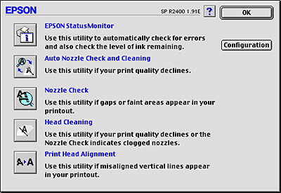 Click this button to open the Configuration dialog box, where you can change the method by which the EPSON Status Monitor utility notifies you when the printer status changes. |