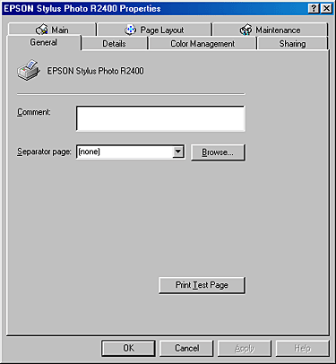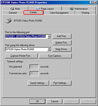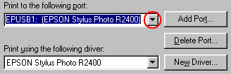 If EPUSBX: (EPSON Stylus Photo R2400) is displayed in the Print to the following port list, then the USB printer device driver and printer software are installed correctly. If the correct port is not displayed, proceed to the next step.