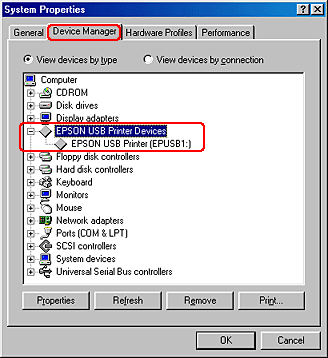 If your drivers are correctly installed, EPSON USB Printer Devices should appear on the Device Manager menu.