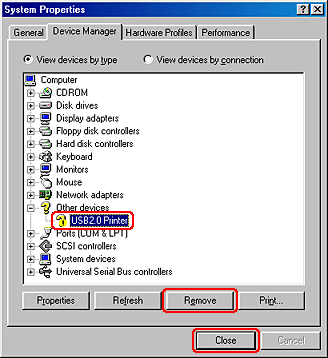 Under Other devices, select USB Printer or EPSON Stylus Photo R2400 and click Remove. Then, click OK.