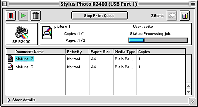 EPSON Spool Manager is similar to Windows Print Manager. If it receives two or more print jobs at one time, it holds them in the order that they were received (with printers on a network this may be called a print queue). When a print job reaches the top of the queue, the EPSON Spool Manager sends the job to the printer. You can cancel print jobs from the Spool Manager. You can also view print status information about the print jobs which have been sent to your printer, as well as pause and resume or restart selected print jobs.
