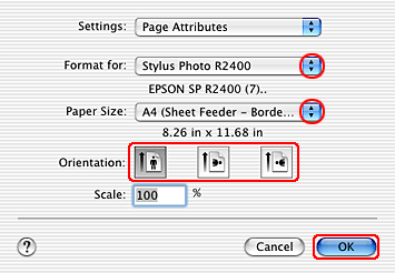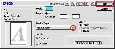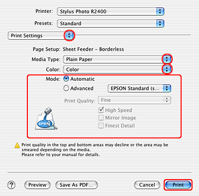Select Stylus Photo R2400 as the Print setting, then make the Copies & Pages settings.