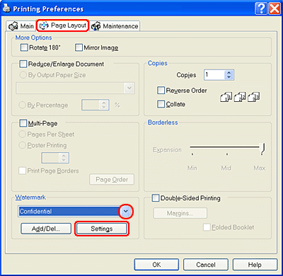 | Click the Page Layout tab, choose the desired watermark from the Watermark list, then click Settings. |