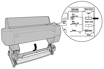 Press the Paper Source button repeatedly on the printer until the Roll Auto Cut light comes on. Then press the Cut/Eject button. The roll paper is cut automatically.