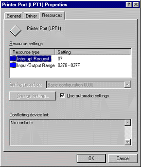 | Click the Resources tab and select the Use automatic settings check box to deselect the Automatic Setting. Write down the Input/Output Range settings shown in the Resource settings box. |