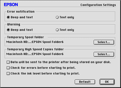 You can select the way the EPSON StatusMonitor utility monitors your printer, and the way you will be notified of information. Click the Configuration button in the Utility dialog box. (To access the Utility dialog box, see Accessing the printer utilities.) The Configuration Settings dialog box appears as below.