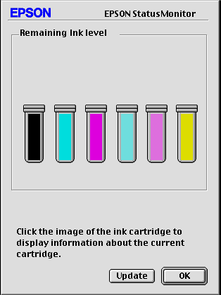 The EPSON StatusMonitor informs you of the amount of ink remaining as of the time the StatusMonitor was opened. To update ink-level information, click the Update button.