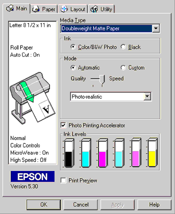 In the Ink box, if you use UltraChrome ink, select Color/B&W Photo to print color, or Black to print a draft or black text only. If you use ColorFast or dye ink, select Color to print in color, or Black to print in black and white.