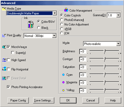 The Advanced setting gives you complete control over your printing environment. Use these settings to experiment with new printing ideas, or to fine-tune a range of print settings to meet your individual needs. Once you are satisfied with your new settings, you can give them a name and add them to the Custom Settings list.