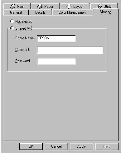 Click Shared As radio button, enter the printer information as needed, then click OK.