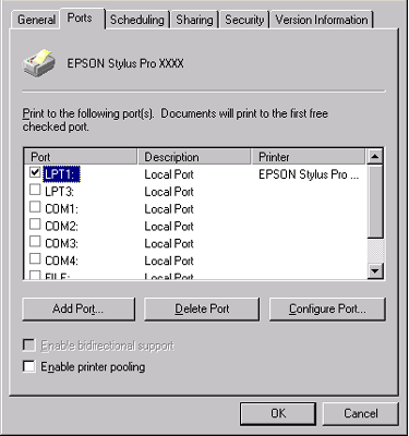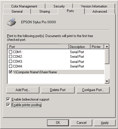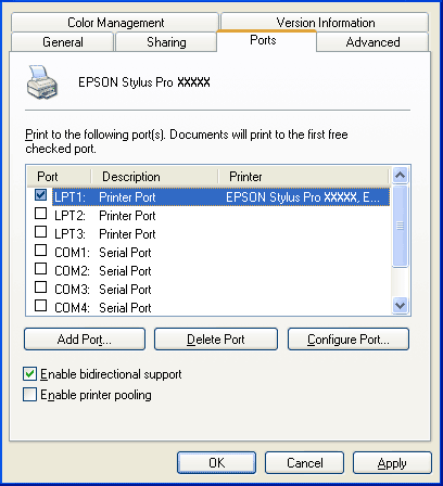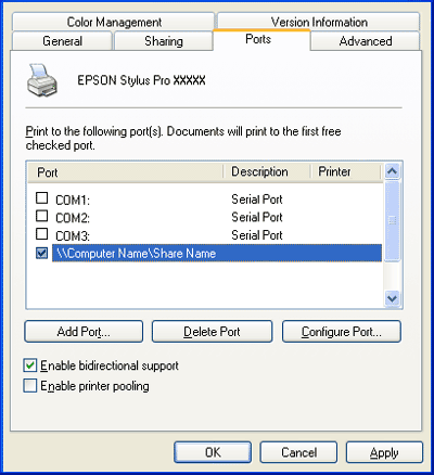 On the Ports menu, make sure that the new port is added and the check box is selected. Click OK to close the printer driver.