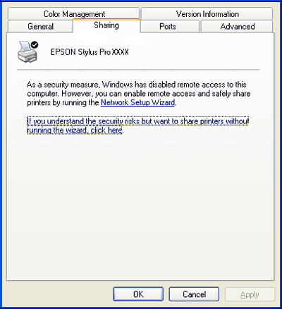 Right-click your printer icon, and click Sharing in the menu that appears. If the following menu appears, click Network Setup Wizard or If you understand the security risks but want to share printers without running the wizard, click here, and follow the on-screen instruction.