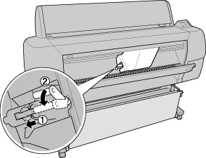 Push in the side pin while turning the paper cutter cover to the left to close the casing.
