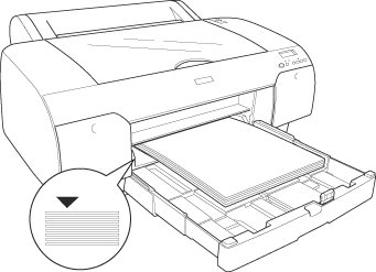 The paper tray can hold up to 250 sheets of 17 lb. or 64 g/m2 plain paper. Do not load paper above the arrow mark on the inside surface of the right edge guide.
