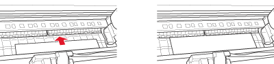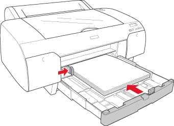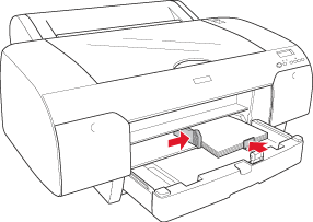 | Adjust the right side of the paper with the line marked with arrow mark, and also adjust the bottom edge of the paper with the line marked with A4/B4 on the paper tray. |