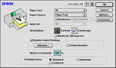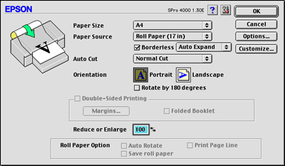 You can make Paper Size, Paper Source, Borderless, Orientation, Reduce or Enlarge, Printable Area, and Roll Paper Option settings in this dialog box.