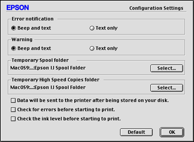 You can select the way the EPSON StatusMonitor utility monitors your printer, and the way you will be notified of information. To make Configuration settings, click Configuration in the Utility dialog box. The Configuration Settings dialog box appears.