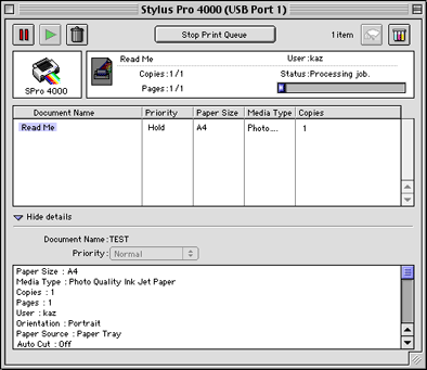 After you send a print job to the printer, you can use the EPSON Monitor IV utility to check, cancel, or change the priority of print job that are queued for printing. This utility also shows the status of the job currently being printed.