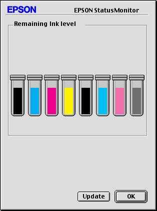 EPSON StatusMonitor informs you of the amount of ink remaining as of the time the StatusMonitor was opened. To update ink-level information, click Update.