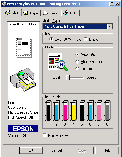 Make the Ink setting. Select Color/B&W Photo to print color or monotone photos, or Black to print a draft or black text only.