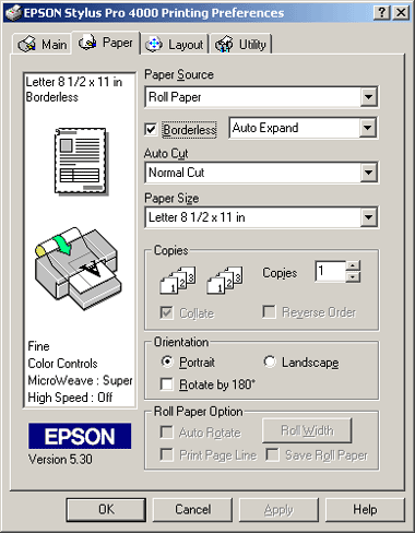 When Roll Paper or Roll Paper (Banner) is selected as the Paper Source, make the Roll Paper Option settings as needed. See Making the Roll Paper Option settings.