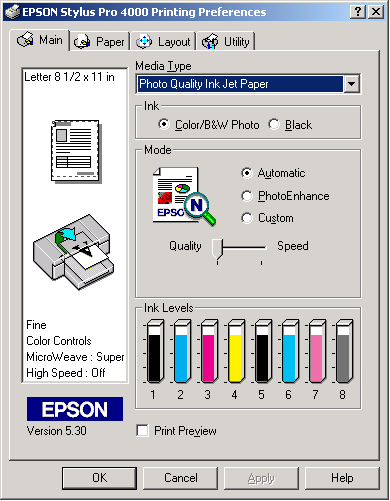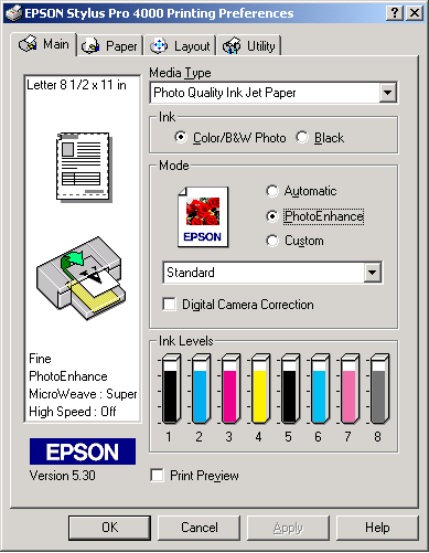 You can select Automatic, PhotoEnhance, or Custom mode. These modes are arranged to give you three levels of control over the printer driver.