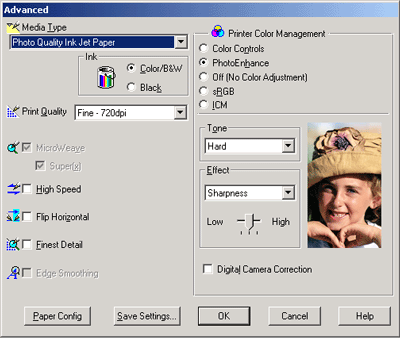 Selecting PhotoEnhance also enables the Digital Camera Correction check box. Select this check box when you are printing photos taken with a digital camera to give your printed images the smooth, natural appearance of photographs taken with a film camera.