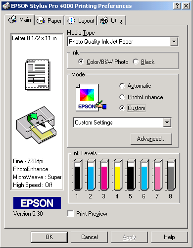 Custom mode lets you make a wide range of changes with a single click of the mouse. In the Custom Settings pull-down menu, you will find ready-made settings provided by Epson. They are designed to match particular kinds of printouts, such as graphs and charts for a presentation.