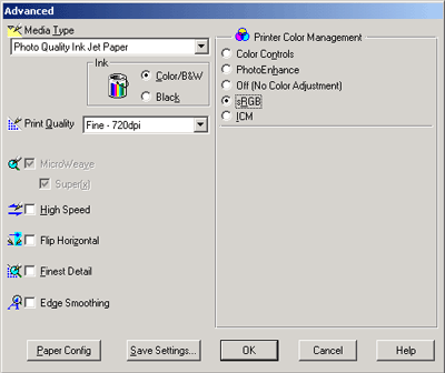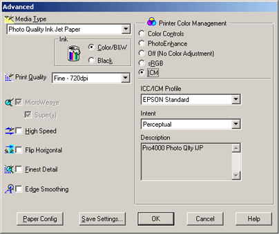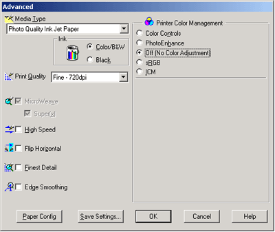 The Advanced setting gives you complete control over your printing environment. Use these settings to experiment with new printing ideas, or to fine-tune a range of print settings to meet your individual needs. Once you are satisfied with your new settings, you can give them a name and add them to the Custom Settings pull-down menu.