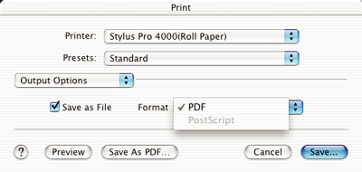 You can print your data as a file if you click the Save as file check box, and select its format from the Format pull down menu.