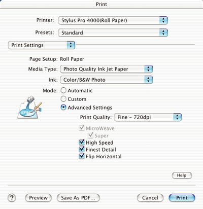 Advanced Setting gives you complete control over your printing environment. Use these settings to experiment with new printing ideas, or to fine-tune a range of print settings to meet your individual needs. Once you are satisfied with your new settings, you can give them a name and add them to the Custom Settings list.