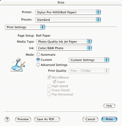 Use these settings to experiment with new printing ideas or to fine-tune a range of printer settings to meet your individual needs. Once you are satisfied with your new settings, you can add them to the Custom Setting list in the Print dialog box.