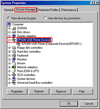If your drivers are correctly installed, EPSON USB Printer Device should appear on the Device Manager menu.