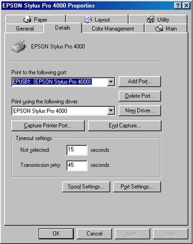 Make sure the EPSON Stylus Pro 4000 is selected for the printer port.
