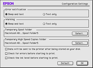 You can select the way the StatusMonitor utility monitors your printer, and the way you will be notified of information. Click the Configuration button in the Utility dialog box. (To access the Utility dialog box, see For Macintosh.) The Configuration Settings dialog box appears as below.