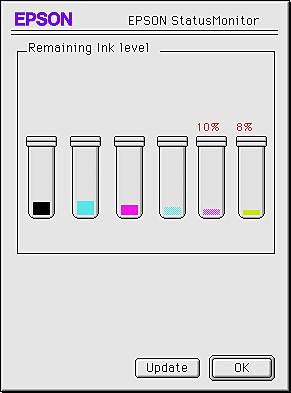 The StatusMonitor informs you of the amount of ink remaining at the time the StatusMonitor was opened. To update ink-level information, click the Update button.