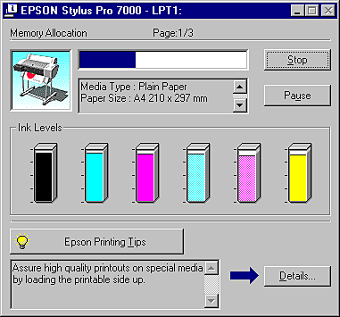 Tips for getting the most out of your EPSON printer driver appear at the bottom of the Progress Meter window. A new tip appears every 30 seconds. For more details on a displayed tip, click the Details button.