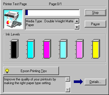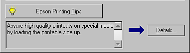 Tips for getting the most out of your EPSON printer driver appear at the bottom of the Progress Meter window. A new tip appears every 30 seconds. For more details on a displayed tip, click the Details button.