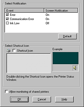 The Monitoring Preference dialog box allows you to specify the monitoring feature of the EPSON Status Monitor 3. Follow the steps below.
