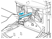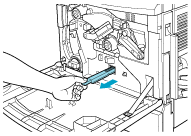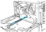Turn the large lever clockwise, until the lever rests on the photoconductor unit as shown below.