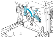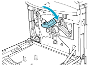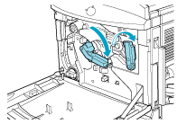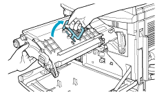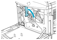 Turn the large lever clockwise, until the lever rests on the photoconductor unit as shown below.