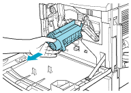 Hold the transfer belt unit by the handle and slowly pull the whole unit out of the printer while tilting the unit slightly downward.