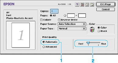 | Select the Automatic radio button on Print Quality. Then choose desired printing resolution from Fast (300 dpi) or Fine (600 dpi) with the slider bar. |