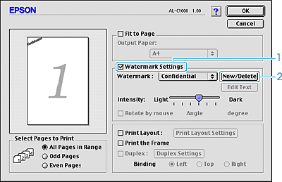 Follow the steps to use a watermark on your document. In the Layout dialog box, you can select from a list of predefined watermarks, or you can select a bitmap (PICT) file or text file as your own custom watermark. The Layout dialog box also allows you to make a variety of detailed watermark settings. For example, you can select the size, intensity, and position of your watermark.